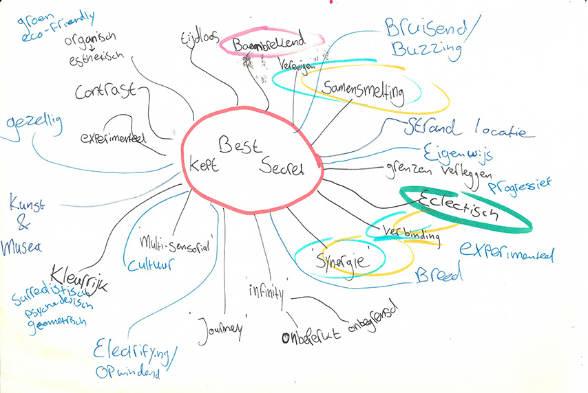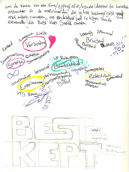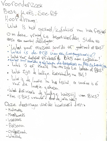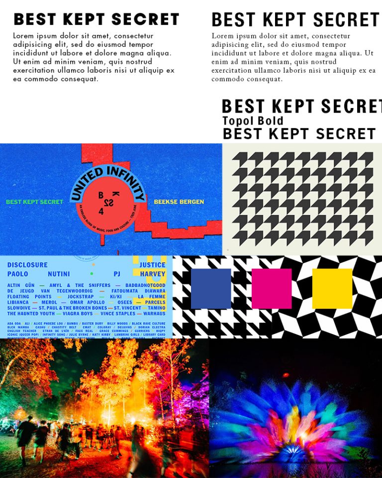 Tijdens de eerste fase van het project ben ik me gaan oriƫnteren op de huidige huisstijl en vormtaal van het festival, en heb vervolgens een merkwaarde gekozen op basis van mijn onderzoek die ik het beste bij de kernwaarden van Best Kept Secret Festival.