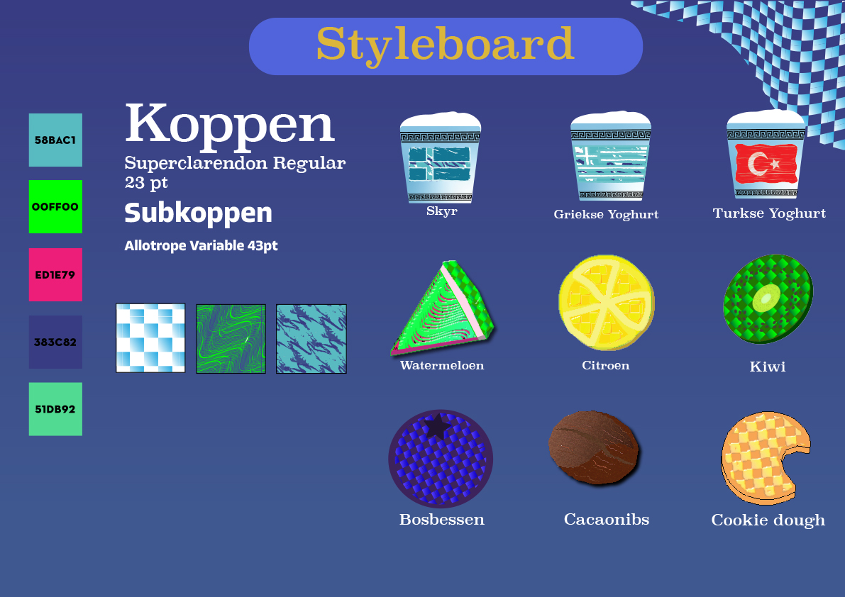 Ik heb door een styleboard te maken mijn vormtaal/visuele identiteit duidelijk weergegeven. Zowel lettertypes, als kleuren, en patronen zijn duidelijk te zien, met bijbehorende details zoals kleurcode, en lettergrootte.