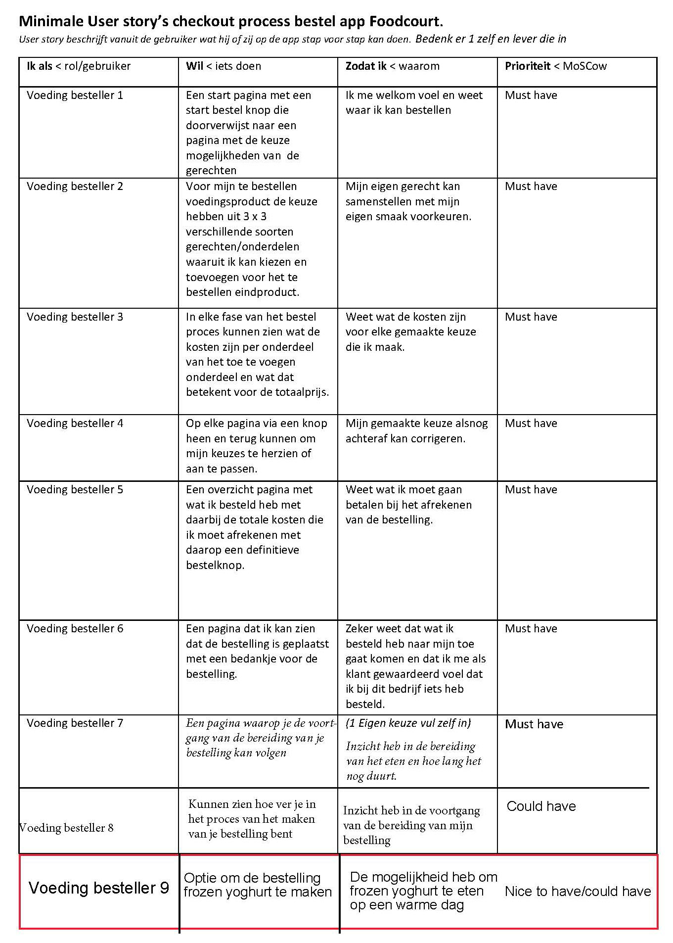 Voordat ik begon met het schetsen van de low-fidelity wireframes voor het prototype van de app, heb ik een aantal user stories opgeschreven, die vastleggen welke functies hoe dan ook terug moeten komen in de app, zowel als functies die fijn zouden zijn om in de app terug te zien, mocht er tijd over zijn na het implementeren van de kernfunctionaliteiten.